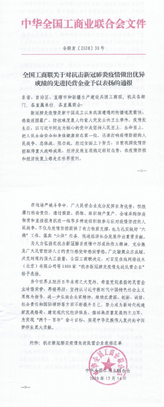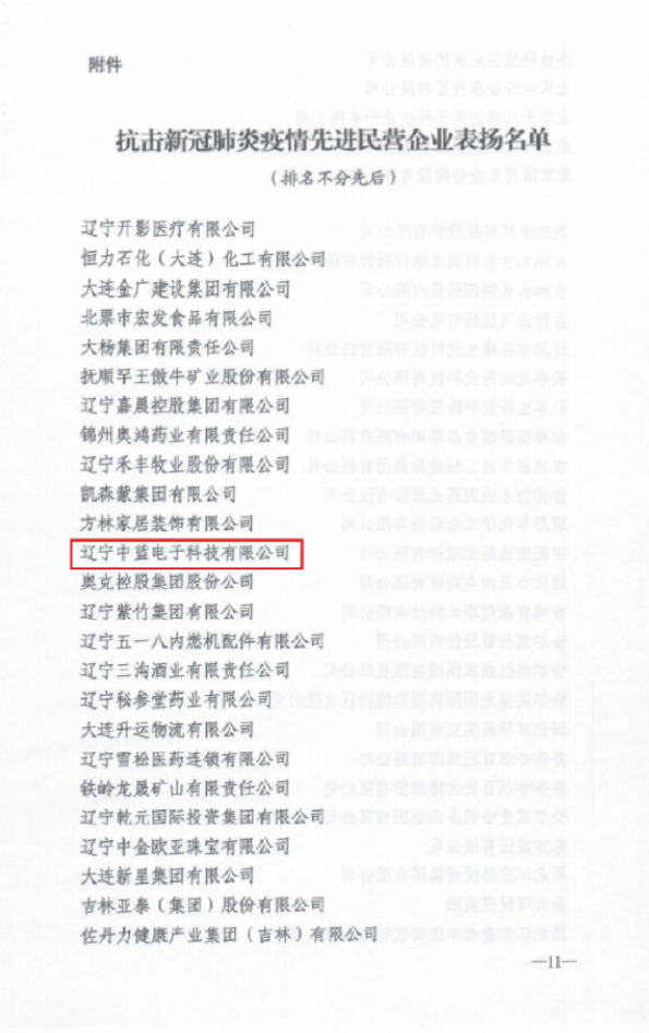 為大力弘揚(yáng)在抗擊新冠肺炎疫情中形成的偉大精神,充分激發(fā)廣大民營經(jīng)濟(jì)人士的責(zé)任感使命感榮譽(yù)感,廣泛凝聚眾志成城、共克時艱的強(qiáng)大正能量,12月14日,全國工商聯(lián)對在抗擊新冠肺炎疫情工作中做出優(yōu)異成績的一批先進(jìn)民營企業(yè)進(jìn)行了通報(bào)表揚(yáng)。此次,全國共有1000家民營企業(yè)被授予“抗擊新冠肺炎疫情先進(jìn)民營企業(yè)”稱號,遼寧省上榜27家企業(yè),盤錦市上榜2家企業(yè)。其中,遼寧中藍(lán)電子科技有限公司入圍全國工商聯(lián)通報(bào)表揚(yáng)榜單,榮獲全國抗疫先進(jìn)民營企業(yè)。
