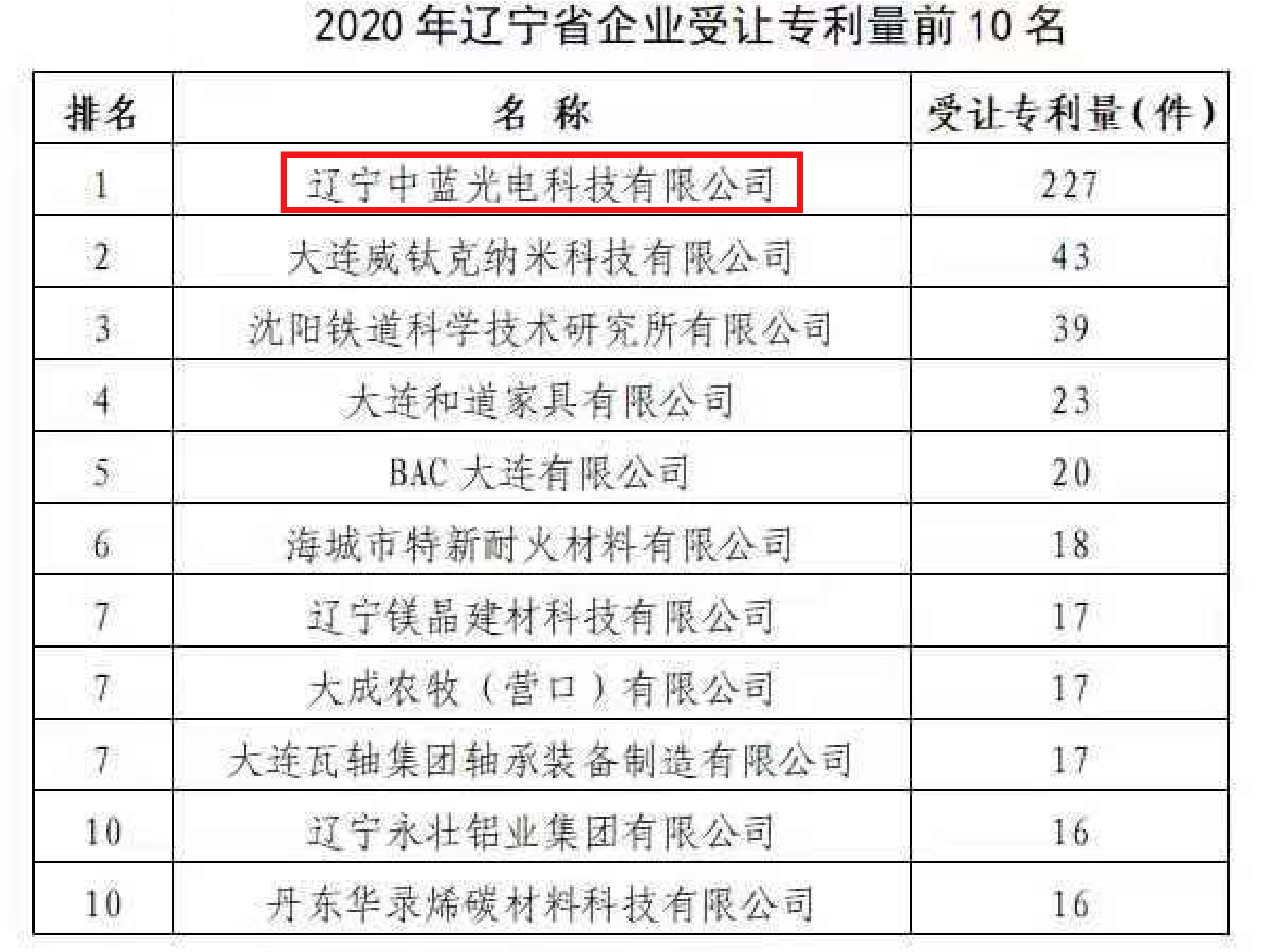 作為國(guó)家知識(shí)產(chǎn)權(quán)優(yōu)勢(shì)企業(yè),中藍(lán)榮登遼寧省企業(yè)受讓專利量十強(qiáng)榜首。
